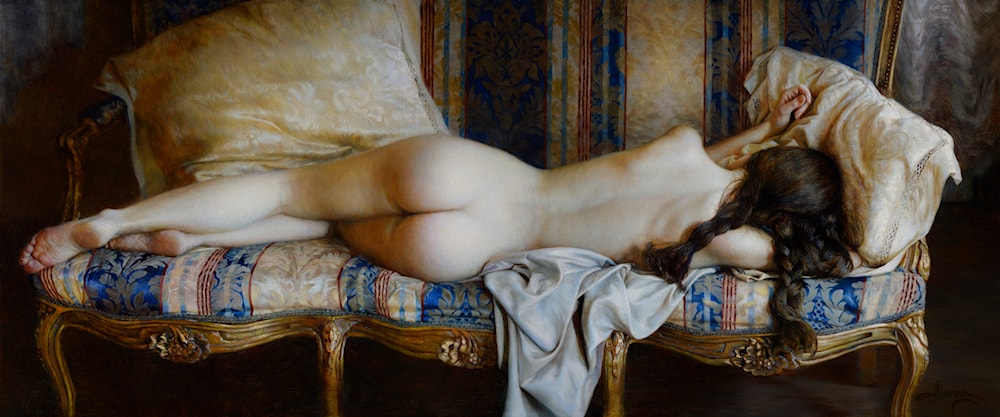 The painting "A reclining nude" was painted in 2018 and at that moment it became a milestone and a significant achievement in my work. I work with the method of multilayer painting and actively study and use various techniques of old master-painters (glazing through brushstroke, etc.), and also experiment on my own in order to achieve the greatest realism and expressiveness of the image. I am interested not only in the illusion, but also the depth of space in the painting, which creates a 3D effect that is achieved exclusively through the skill of the painter. In this work, I worked hard to convey the difference in textures of the girl's skin, her hair, the fabric of the sofa upholstery, and I also tried to convey the softness and transitions of natural light and the beauty of the natural matte skin tones of the model.