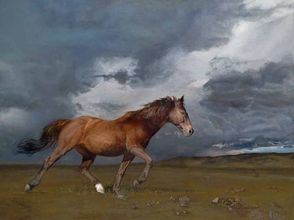 My knowledge of anatomy helped me to accurately portray “Ma Cherie” with sensitivity and care in the details. I have chosen to isolate her from her herd and paint her as a solitary individual hurrying to isolate herself from the darkness of the summer prairie storm threatening to overtake her. Her spirit carries her forward.