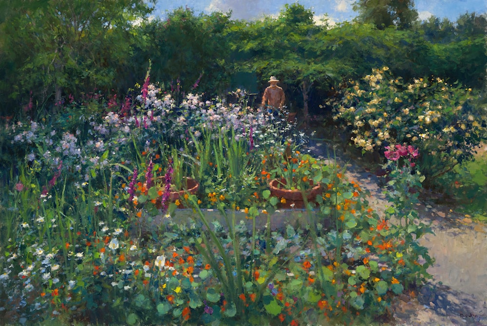 My wife and I have had this garden for 30 years and paint it each spring and summer. It's always most lush in May and June, and that is the time of year I painted this. It's the morning light and I worked on it for several sessions, as I stand, observe and paint each day. The garden is always a joy to behold and a difficult subject to paint. Lots or roses, foxglove, daisies, poppies and nasturtiums. The light seems to dance across the flowers and foliage which are changing day by day.