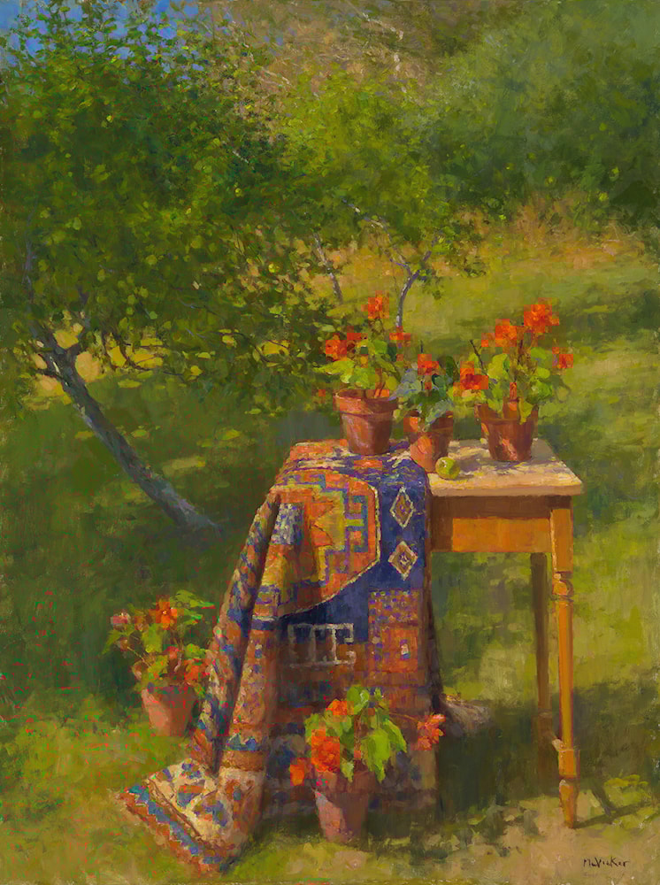 This is painted in our yard by the apple trees. A summer painting where I combined the potted begonias I was growing, with my studio table and rug, placed in the yard. Painted over several sessions at the same time each afternoon, I tried to capture the sunlight as it moves across the yard and the still life. I like the combination of a still life idea taken outdoors to paint plein air.