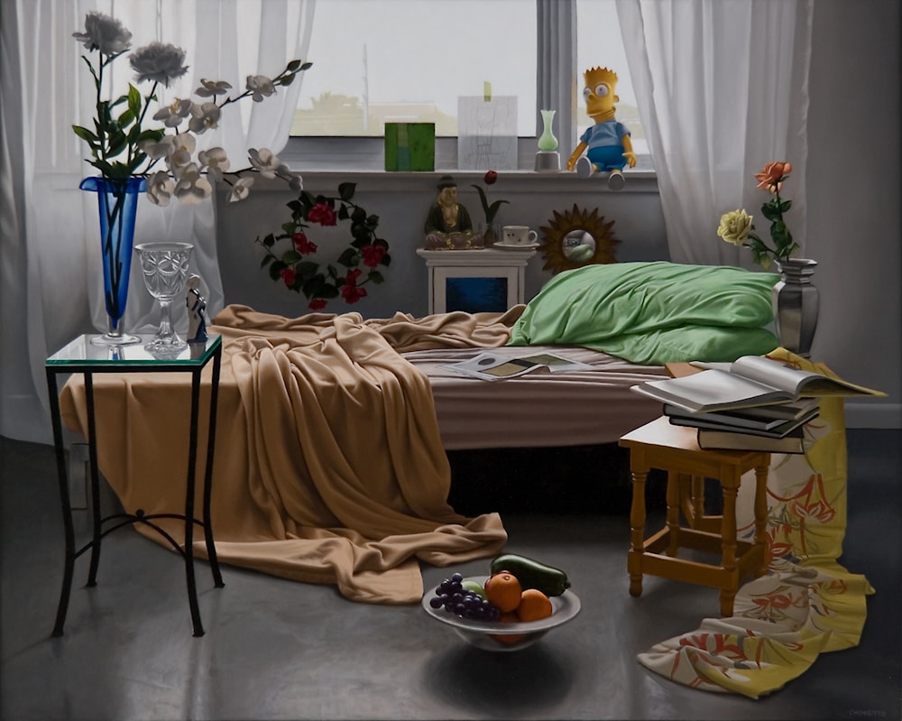 When I moved into my new loft space, I was faced with renovations. However, I always kept one corner clean and tidy to set up the still life. This image is one of those still lives under a window. Working this way presented challenges but it all worked out well in the end... and as was usual in many of these paintings, Bart would make his appearance!