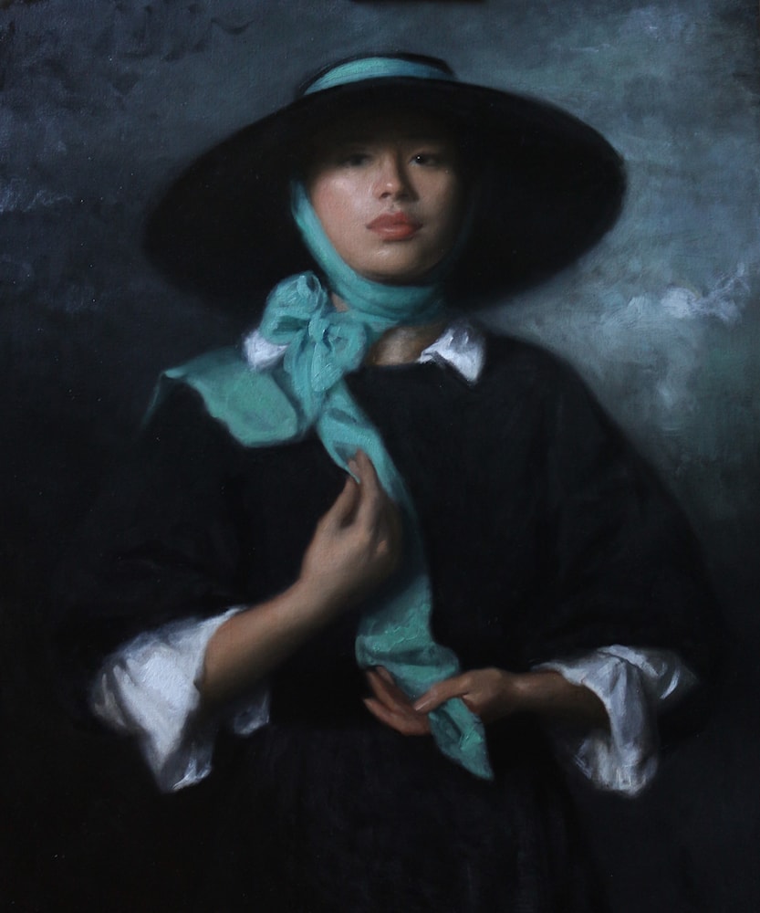 This portrait was painted at the Charles H. Cecil studios in Florence, Italy. Rominha posed for 1 month and I painted it entirely from life, under natural light, using the sight size method. Rominha is Peruvian but moved to Florence as a child with her family. This is the last of 5 portraits I painted of her over a period of 3 months. It was wonderful to paint one person so many times, as it gave me the opportunity to experiment with composition and technique. She was an incredibly inspiring model who was so present throughout the process. We exchanged ideas and looked at old master paintings together to help me solve problems I encountered in the composition along the way. In my portraits I strive to evoke the timelessness in the old master paintings I most admire, but at the same time, create something relevant to now.