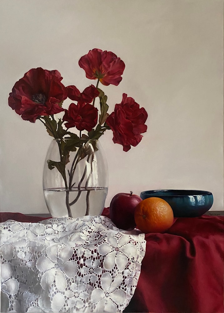 In this still life, I have explored value, texture, and color harmony. I have used vivid and vibrant colors and patterned fabric which inspire nature. The harmony of colors and the reflection of sunlight on the objects have given them a sense of life.