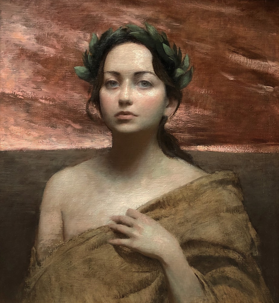 A portrait of a young woman bearing great promise for the future, both for herself and for the world around her. The inspiration that influenced this painting during its creation came from the fact that the subject (whose name is Francesca) was receiving her doctorate in psychology at the time this painting was being made. What began as a solemn, simple portrait, evolved into something more hopeful and forthright. Both the inclusion of the laurel wreath (worn by those who graduate from university in Italy) and her deliberate but soft gaze are meant to convey, in visual terms, this precipitous moment in her life. In some ways the painting is a documentation of this occasion, and in others it is a token of good wishes, celebrating her achievement, along with the achievements of all others who seek the betterment of society through diligence and careful study.