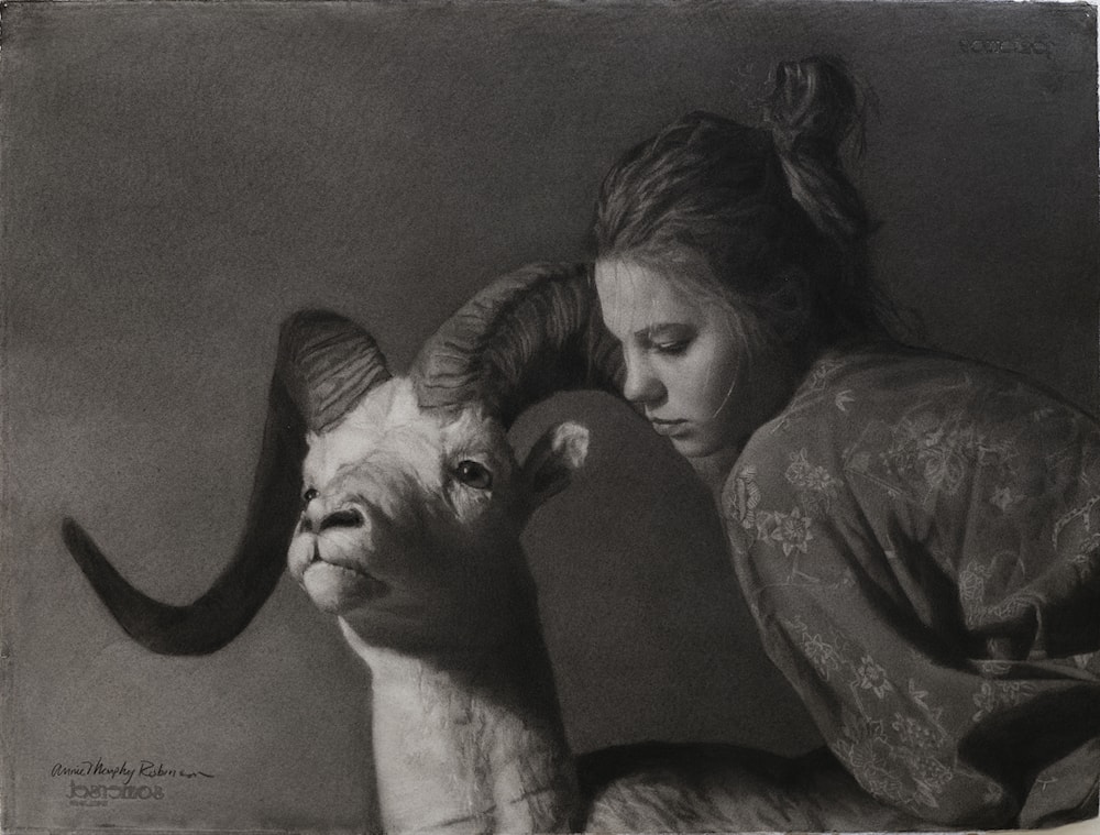 This drawing is about soul connection- The sharing of bodies or souls between the two figures seems possible at as the young female leans in, listening to the silent whispers of the ram.