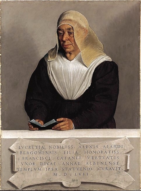 The painting that most struck me, and strikes me still to this day, is Moroni's portrait of Abbess Lucrezia Agliardi Vertova. This work has a stark simplicity. The elderly sitter stands or sits behind a stone ledge, one-third up from the bottom of the canvas. The fictive stone entablature has a Latin inscription on a veined marble escutcheon that tells us the sitter was "Lucretia, daughter of the most noble Alessio Agliardi of Bergamo, wife of the most honorable Francesco Cataneo Vertova, herself founded the Church of Saint Anne at Albino. 1557." Such inscriptions are not uncommon in Moroni's work, although this one is the most complex.