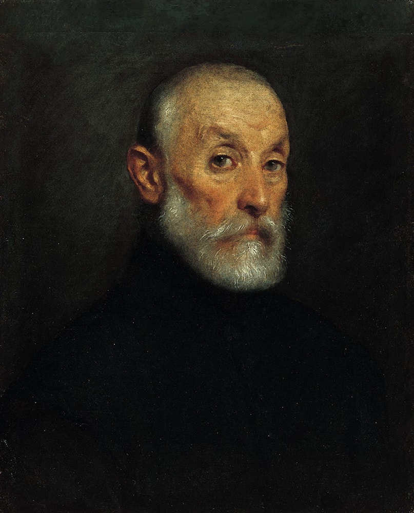 In the third of my small selection, the so-called Portrait of a Magistrate in the University of Arizona Museum of Art, Tucson, there is a decided downward turn to the proper left side of the mouth. This feature might indicate that the sitter suffered a slight stroke. It certainly adds to the impassive stare of the sitter. The format is much more modest, and the color range is at once warmer and narrower. The dark background isolates the tightly cropped figure in an ambiguous space, similar to that used in Tintoretto's portraits.