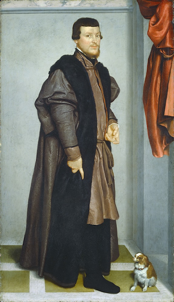 The young painter was commissioned to paint full-length portraits of the Madruzzo brothers, nephews of the Prince-Bishop of Trent, Cardinal Cristoforo Madruzzo, who presided over the Council. Titian had painted Cristoforo's full-length portrait in 1552 (now in the Sao Paolo Museum of Art, Brazil). The Cardinal's nephews' portraits were probably executed shortly after by Moroni. Gian Lodovico's portrait is now in the Art Institute of Chicago and Gian Federico's portrait hangs in the National Gallery, Washington, DC. Very likely, the elderly Titian would have known these portraits, if not by an actual encounter, then, at least, by reputation. Moroni was already an independent artist, with a distinct vision placing each man in a defined, shallow space, with only vestigial swaggered drapes, accompanied by, in one, a lapdog, and in the other, a hound. The wall behind each is a neutral foil of light gray, with architectural elements that provide compositional stability via a play of horizontals and verticals. The figures have sharp contours, in keeping with Mannerist tendencies, but they lack the usual Mannerist elongations and enhancements. Moroni seems to have responded to the northern feeling for realism that he would have become familiar with in Trent during the late 1540s and early 50s. Moroni had an egalitarian eye, which looked upon the sitter and his clothing with equal interest. This equality of interest contrasts with Titian's rich color harmonies of reds, blacks and pinks. Titian places his black-clad subject in front of a massive crimson drape, which Cardinal Cristoforo pulls back to reveal a clock and documents on a writing table, references to his activities as head of the great church council. Where Titian generalizes, focusing attention on face and hands, Moroni particularizes, so we have a cool sense of who these young men are, and how expensively dressed. The sheen, color and weight of fabrics are as carefully depicted as the features of the sitter