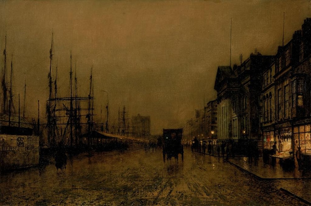 The display includes two works by John Atkinson Grimshaw of Liverpool's Custom House on the dock road in moonlight; a building which was severely damaged during the Liverpool Blitz and later demolished. Paintings by Jean Leon Gerome, Thomas Creswick, Frederick Goodall, Charles Trevor Prescott and Eduardo de Martino are also on display.