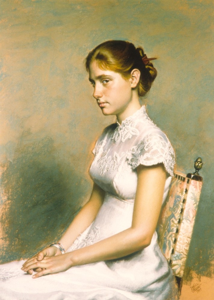 "There is a hushed dignity to her on the one hand, set off by an enormous emotional power, pent up yet under rigid control due to the societal setting that we can only imagine must be occurring from her proper seated position while wearing what appears to be a graduation, debutante or wedding dress. Her bemused sideward glance at the viewer while forever trapped in that setting creates one of the strongest focal points I’ve ever seen in most any other painting.