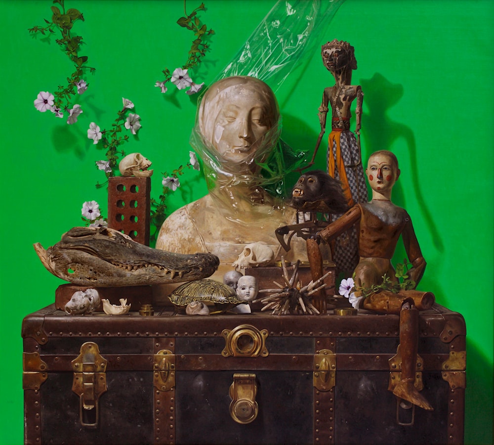 “A lot of thought goes into the way objects interact in my paintings and I like to think of it as casting a play or theatre piece. Performance 3 is one in a series of large scale still lives designed around a prominent color. I'm attracted to high chroma colors as they bring more design and a pop art sense to my work, contrasting with the classical elements and style of my painting method. The plastic veil fills a similar purpose as it references the angular folds that I love in baroque and renaissance drapery depictions. Though filled with macabre elements, nothing is added frivolously. Everything is added for the emotion and tone they bring, working together to tell a specific harmonious story, yet remaining open for the experience and interpretation by the viewer.” – Matthew Bober