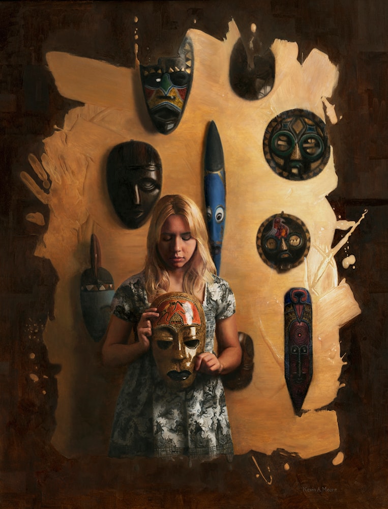 “The Transcendence was originally shown at Rehs Contemporary Galleries as a part an exhibition called ‘Sexes’. This painting is about how feminine beauty is transformed through the masks of makeup, jewelry, clothing, etc. All cultures share these characteristics of enhancing the female body, and an interesting question arises. What do women visually communicate with their bodies through these masks? ” - Kevin Moore