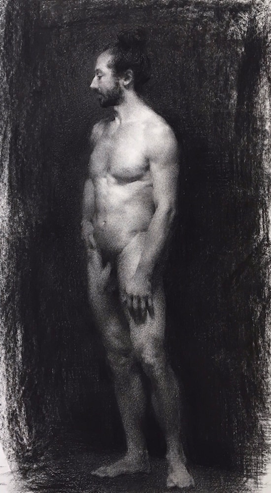 A 5 week charcoal longpose drawing from life of the model Luigi.