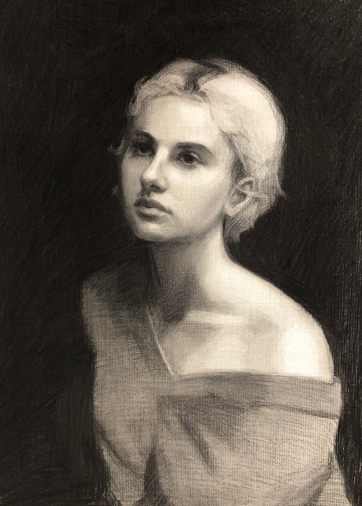 Charcoal portrait of a young woman.