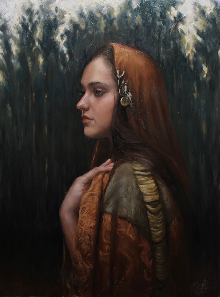 This painting is of Rachel, who holds the sacred connection to her Cherokee ancestors as a mantle and cloak that she wears. Symbolic of the heritage we all share and carry with our ancestors, and have the opportunity to preserve and pass on to generations to come.