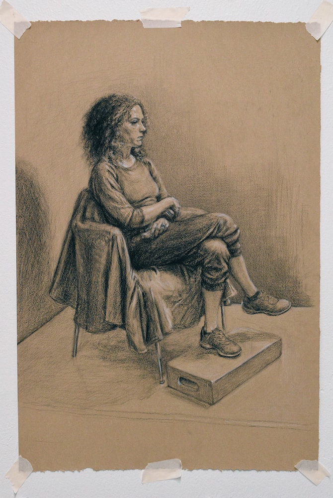 16"x23" Full body still life portrait drawing of a model in class