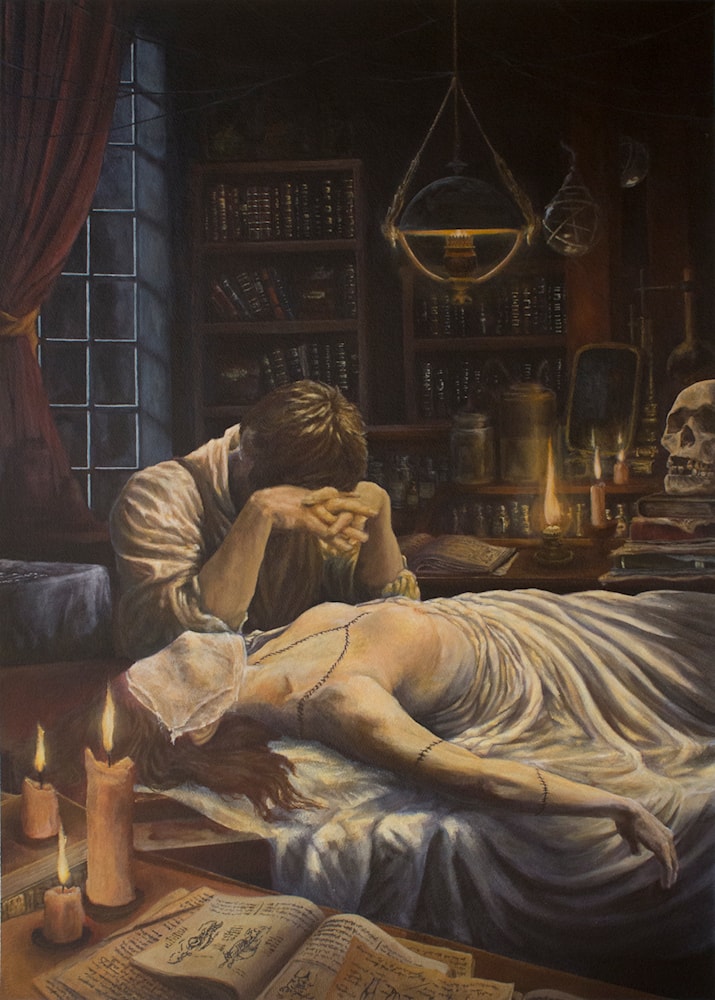 29.75"x41" One of series of acrylic paintings illustrating scenes from "Frankenstein." Depicting Victor Frankenstein in anguish over creating female monster for the monster. He confronts dilemma between freedom and fear in this process. His life and family is under threat of monster if he refuses to make female monster, at the same time the terror of another monstrous being makes him hesitate. Here, Victor's attitude is completely changed from the time he created his first monster. He, as the creator, was obsessed with his creation and was completely unaware of any moral values and monstrosity of his experiment. In contrast, let alone his interest in the secret to life, he has become fearful of his own creation and his decisions are under the monster's influence.