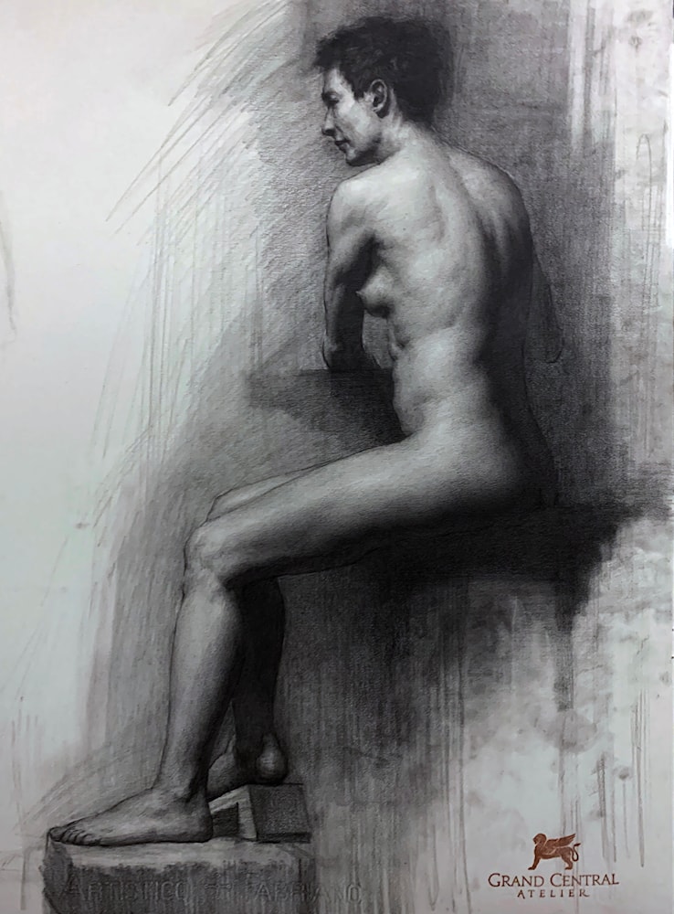 The model appears ready to stand up from her pose. The head looks forward, the trunk twists one way, and the pelvis another. There is a lightness of spirit counterbalanced and grounded by the somber shadows.