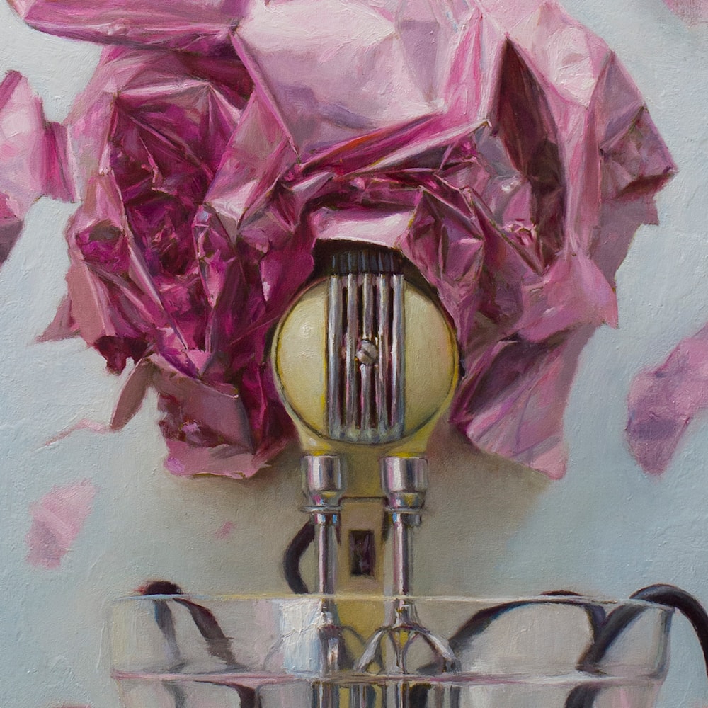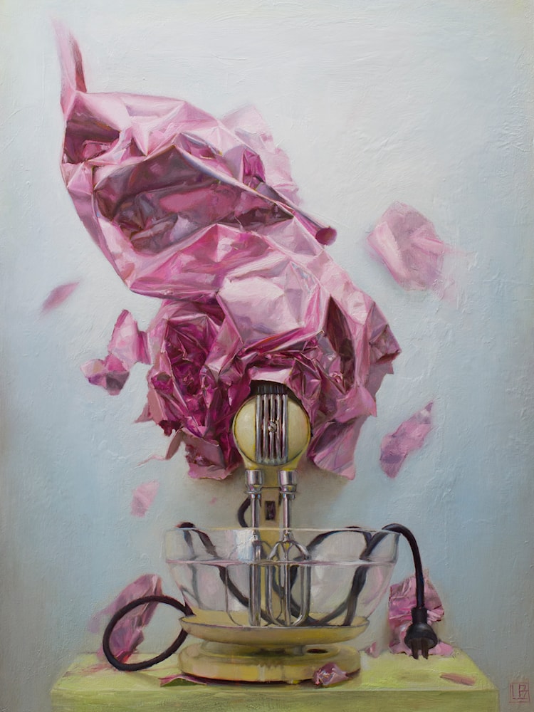 My paintings are a constant investigation of the human condition in the twenty-first century. When exploring specifically the realm of still-life, I tend to use retro objects appearing to be obsolete from functionality only to be appreciated as objects that serve for aesthetic purposes. This world then seeks to draw a reflection of the past while being true to present time. In my work “Unveiled” I try to capture the mundane as an outstanding delight. The painting narrates the climactic event of unveiling a new present, however in this case a used 1940s mixer. In attempts to contrast the old and the new I juxtaposed shiny magenta gift wrapping paper with dynamic rhythmic folds to reveal the old kitchen appliance underneath in a modern sleek way.