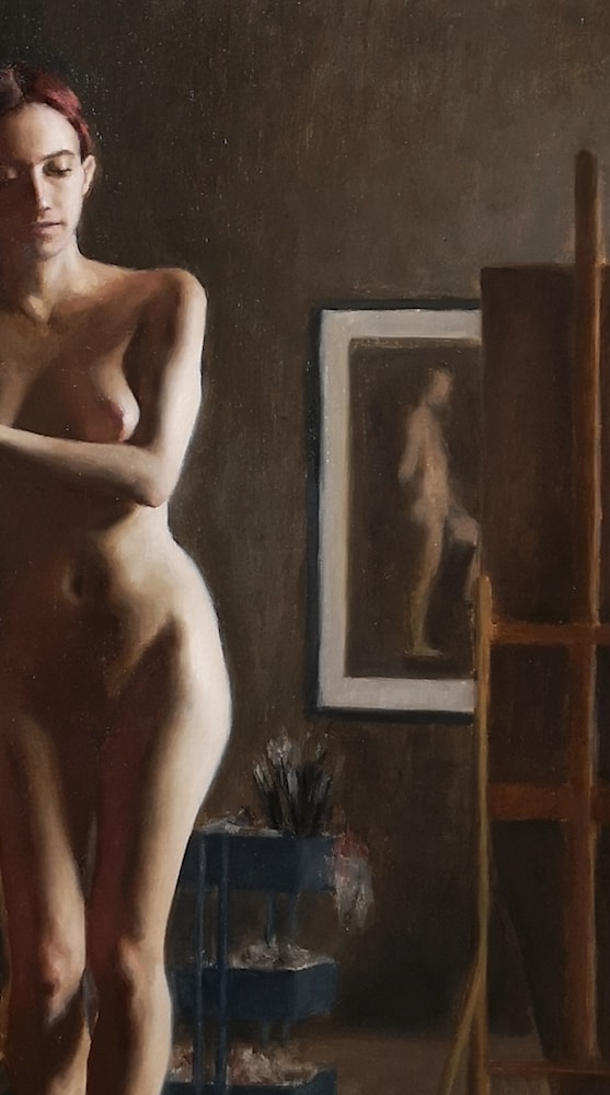 A painting of a figure in interior, the model cancelled due to sickness during the final week, so part of the painting was painted with imagination and memory, without reference of the model.