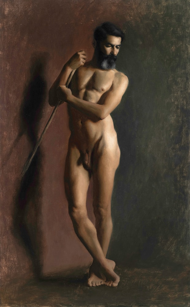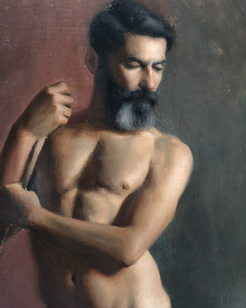 A long pose figure painting. Limited Pallet. Due to the use of the camera for photography, The Main image over exagerate the transparency of the color on the top layer, so the background looks too transparent and the dark values in the sadows are too dark and contrasty. the transitions of values are more close to the close up image.
