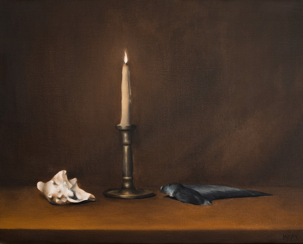 In this still life study I chose to paint 3 objects that reminded me of the myth of Icarus, which is one of my favorite characters from the greek mythology.The light represents the sun, the candle is the wax he and his father used to make the wings.What you can see in the right part of the painting is a wing and in the left is a sea shell representing the sea that swallowed him.