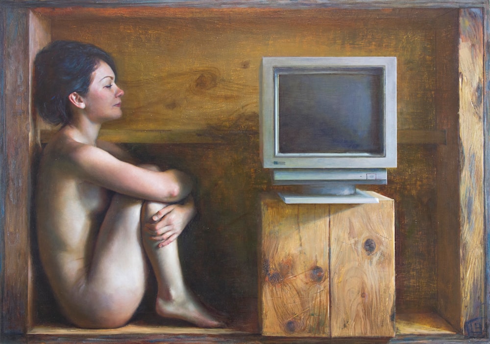 Consolidation represents his turn from traditional still lifes to the interplay between human and machine. An ode to how technology influences human ontology, Consolidation juxtaposes an old computer with a young lady. The machine confronts the viewer directly, while the human figure pays no attention, staring deeply only at the computer. Bononi invites us to look deeper into the modern man’s interaction with technology in the most mature demonstration yet of his ability to play with shadow and space.