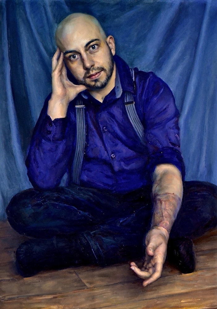 Portrait of transgender friend Max after his gender-change surgery (scar on his forearm)