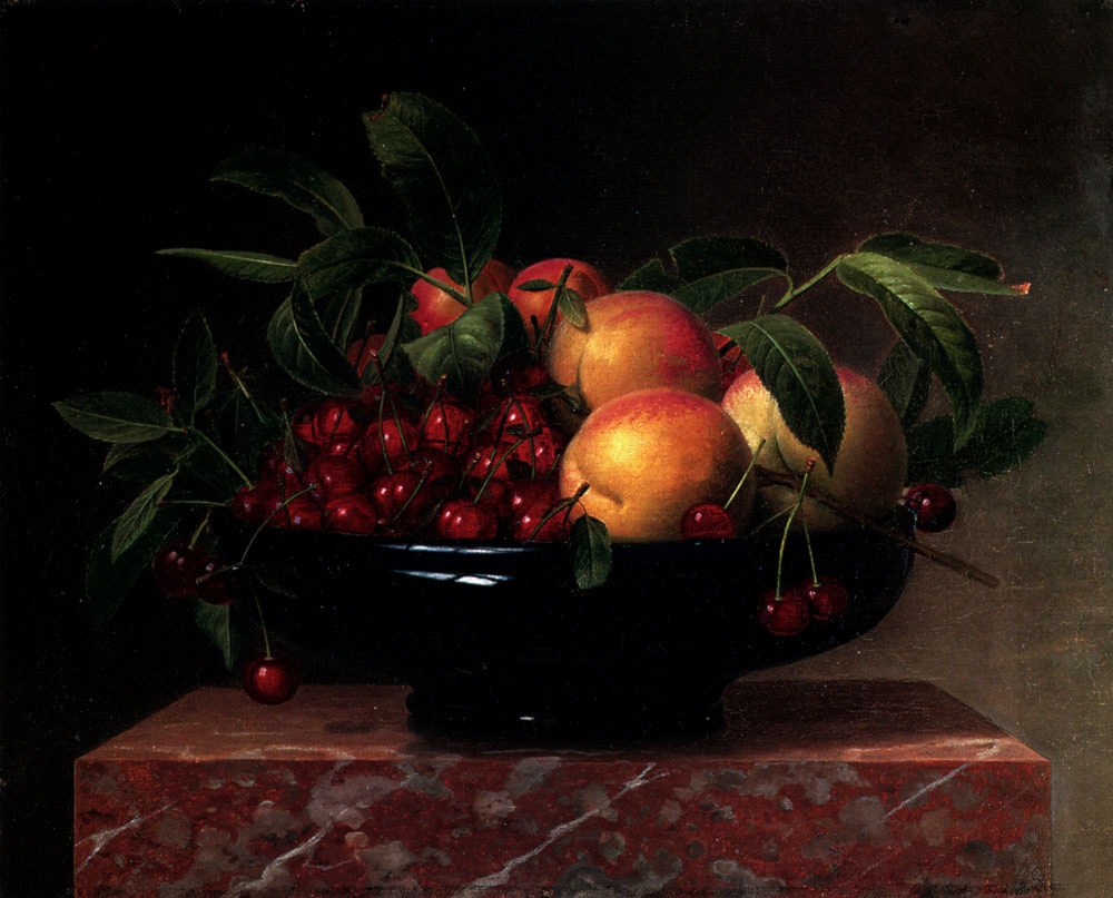 Peaches And Cherries In A Bowl On A Marble Ledge