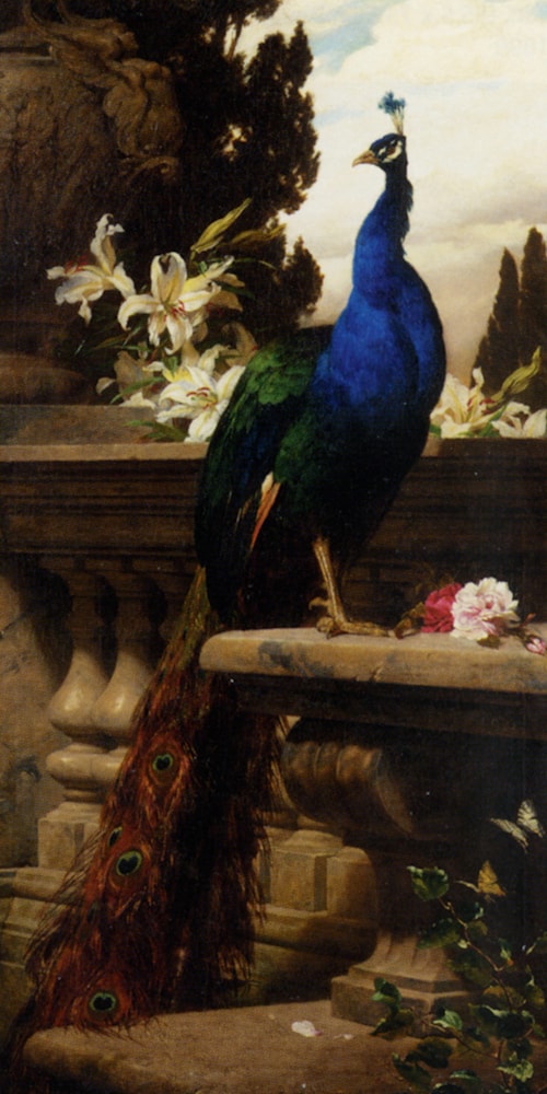 A Peacock in a Classical Landscape with Lillies and Roses