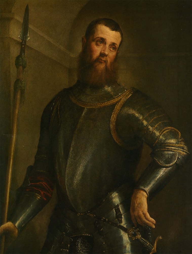 Portrait of a Military Commander three quarter length in armour wearing a broadsword and holding Partigiama