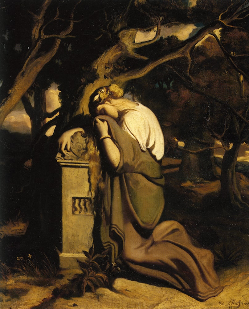 Fille Pleurant Aupres D' un Masolee Dans un Bois d' Oliviers