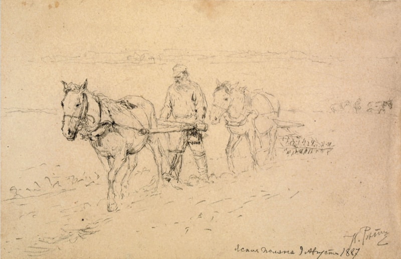 Plowman. Leo Nikolayevich Tolstoy on Arable Land. Sketch