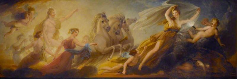 'Phoebus in his Car, preceded by Aurora/ and the Morning Star led on by the Hours/ – jocund to run/ His longitude thro' Heav'ns high road/ The Zephyrs are sporting in his train' (Library Dining Room ceiling painting, 1 of 6)