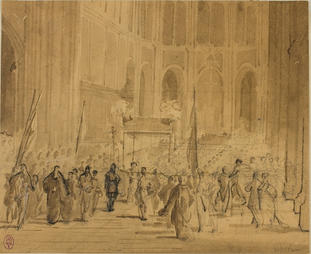 Brush and brown ink and brown wash, with black pencil and graphite, heightened with touches of white gouache, on tan wove paper,