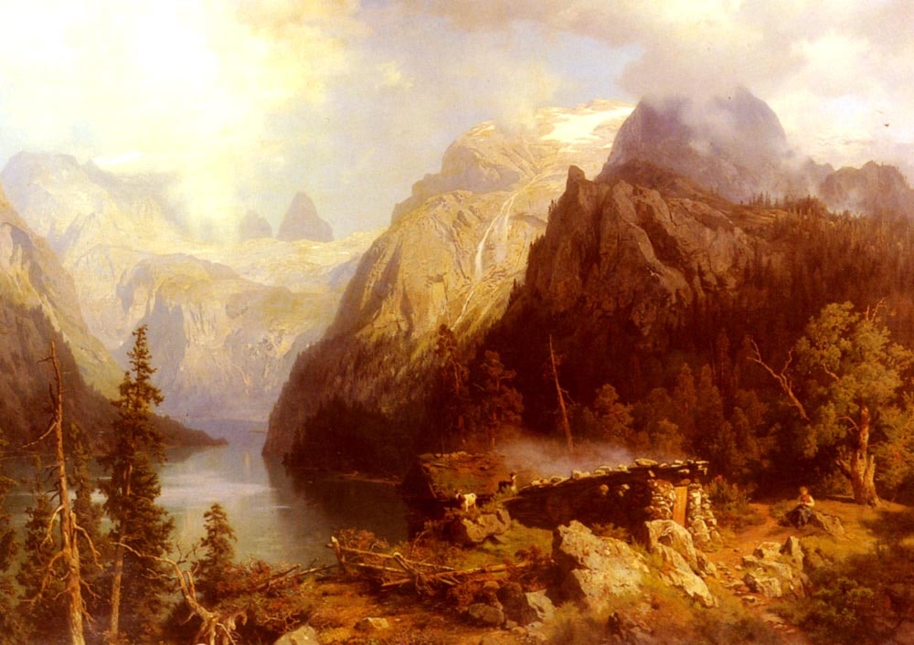 A Shepherdess and Sheep resting by a Lake in an Alpine Landscape