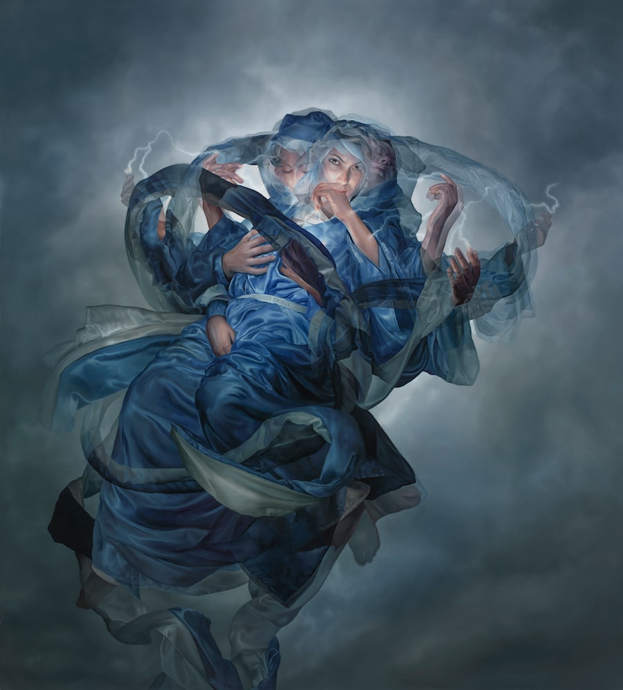 Though this is by far the most time I've spent on any single project - it's entire creation spanning about three years of on and off work - it represents the culmination of everything I know about painting, and in reality took me no less than 36 years to complete. Regardless of religion, I chose to paint Mary because of her starring role as the sacred subject in so many paintings. I see her ongoing prevalence in the art world as a kind of rite of passage - a kind of reminder that she is the focus of some critical work during the career of every artist. Though I am anything but a religious scholar, I found little mention in the Bible or Quran about how exactly Mary conceived. In the Bible the angel Gabriel alludes in an offhand way that the Holy Spirit will take care of things. In the Quran it's said that God "breathed his spirit" into Mary. I decided that if a God, breath, spirit is responsible for your conception, it's probably a pretty memorable experience - hence the multidimensional, stormy sky, St. Elmo's Fire mashup. I took inspiration from many things, more obviously from Bernini's sculpture, Ecstasy of St. Teressa, and ultimately decided to show a more sensual side of Mary as she consents to be taken by a God. Although my painting diverges from other annunciation scenes, the composition I created was done so with reverence towards the person, idol, and idea that is Mary. The inscription on her waist translates as "Bearer of the Immortal", a reference to Mary in either an Arab or Greek text that stuck with me.