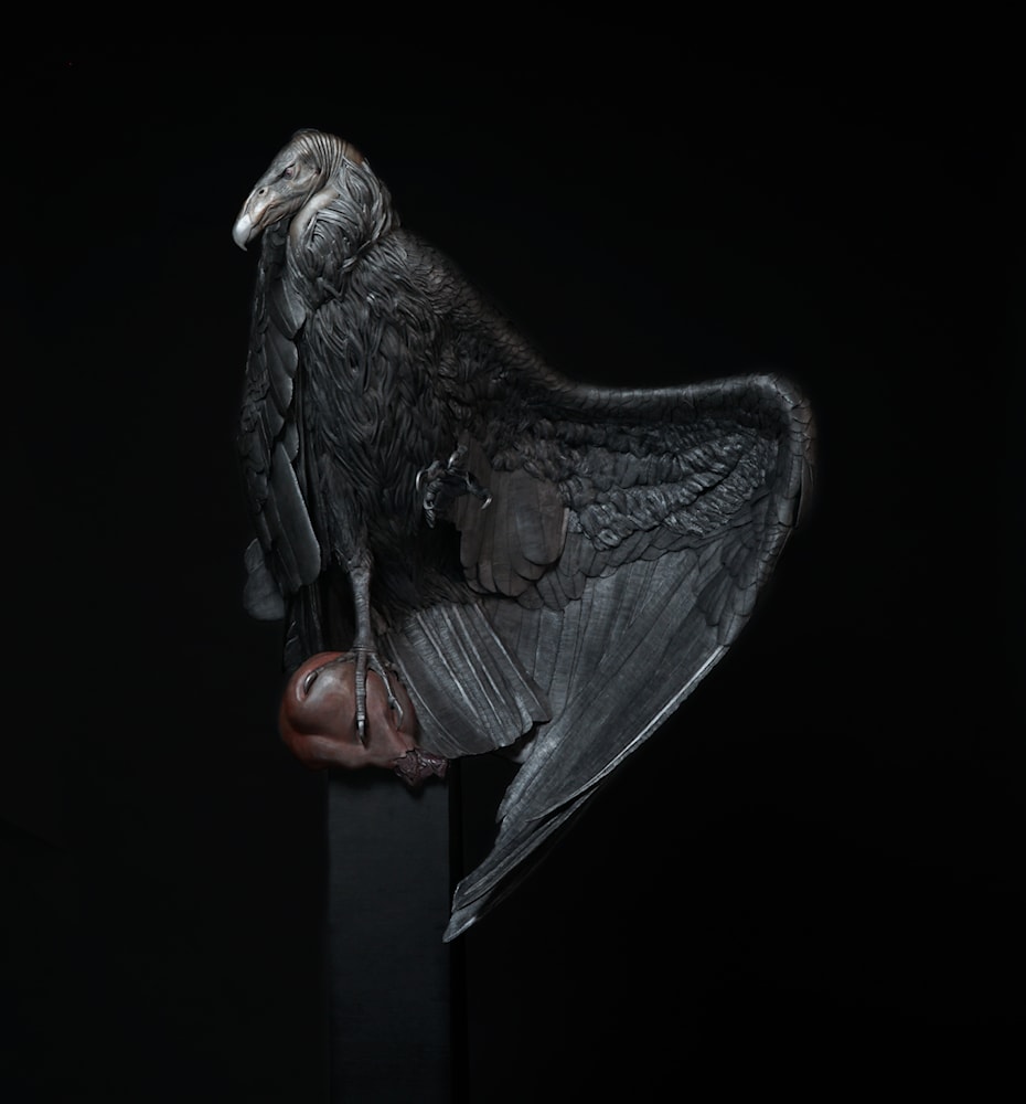 Rascal was initially inspired by a California condor named Dolly who lives at the Los Angeles Zoo. Dolly broke her wing before she could fly. After many attempts to fix her wing, unfortunately it could not be fixed. Condors are incredibly social and because she couldn’t be with her own kind, she was not maturing properly. Now, she spends most days perched in the condor office, with humans. She is very picky about who she trusts, but she has a place and social status and is maturing well. She was definitely one of my favorite animals to meet and sculpt up close. She was the perfect model for my sculptural idea.