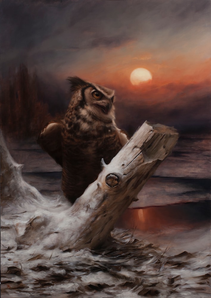 The most variable and endless source of inspiration is nature itself, and so I take as much as I can from disciplined observation of reality; but I also infuse my own impressions and interpretations of that reality, resulting in a personal and intimate work of art. This piece was done from a variety of references, from direct observation, to imagination, to reference from my local raptor center. I really wanted to explore texture and mood for this piece.