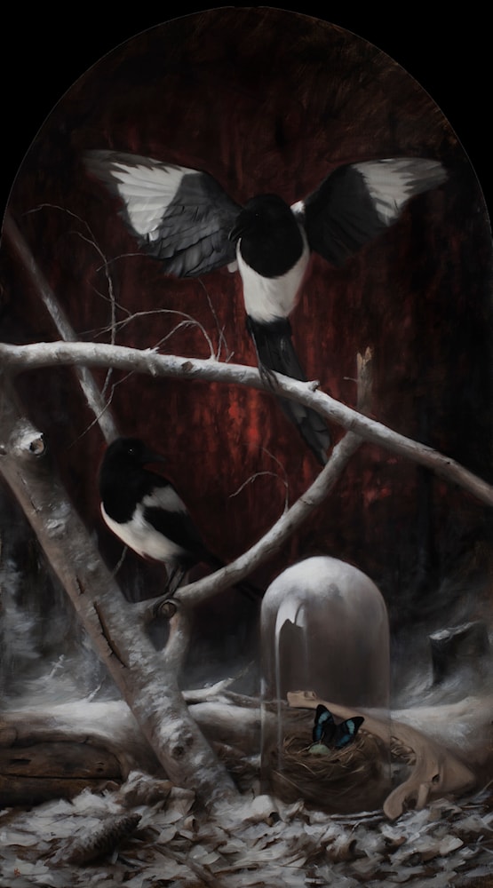 This particular piece is a modern take on the traditional vanitas. The idea of family and protection of our young are explored in a somewhat harsh and austere environment. This piece came about at a time when my wife and I had our first child.