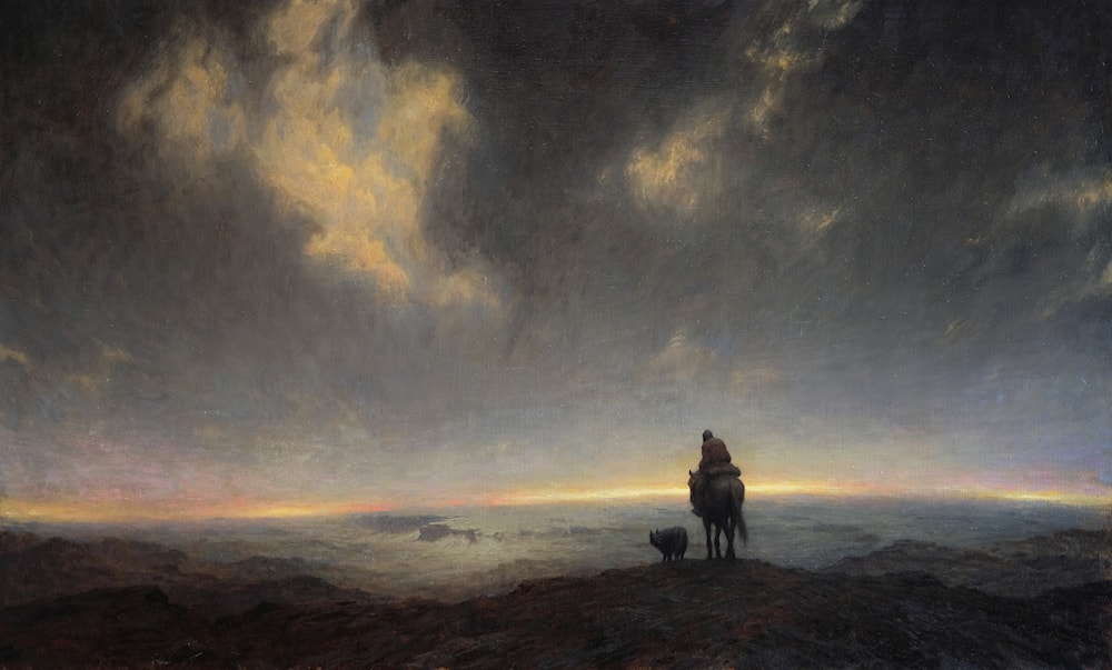 This painting started out as a rather abstract and simple sketch on paper. There was something I found interesting about it but I wasn’t quite sure what that was. I decided that I would find that out in the process and so I started painting. I often know or at least have a strong idea of where I want to end up with a painting, but this time I was quite clueless, lost in the middle of this alien landscape, trying my best to paint myself into some kind of conclusion. This time the rider and I were both set on this journey, this search.