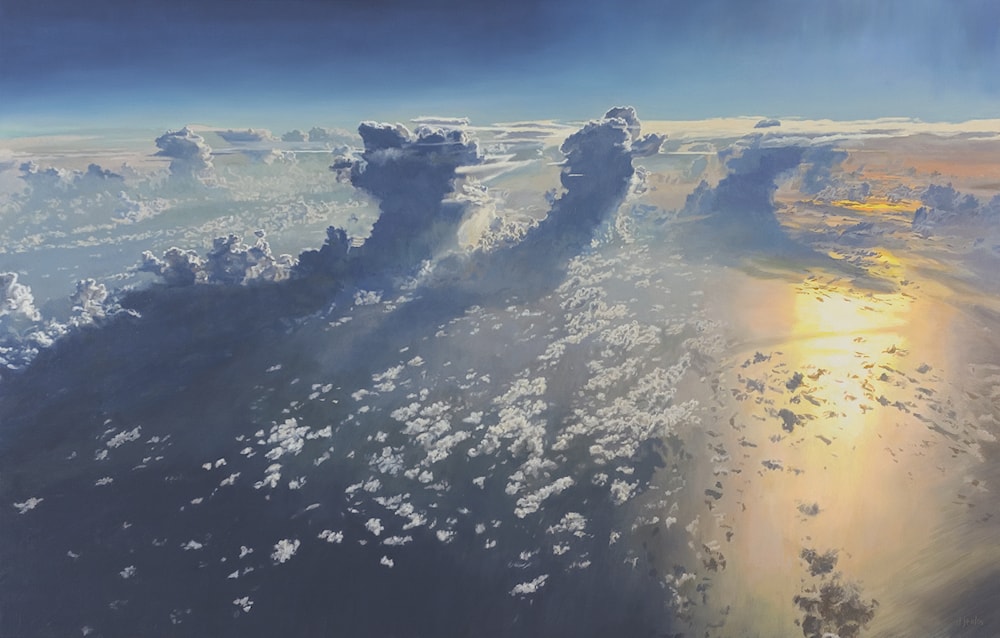 My last trip yielded this view from the window of the plane on the first leg of my return flight to California. I captured it with an iPhone at 8:30 in the morning over the water between Fort Meyers and Houston. As the sun came up it was like “the first day the earth woke up to light.” So said a friend upon seeing the painting.