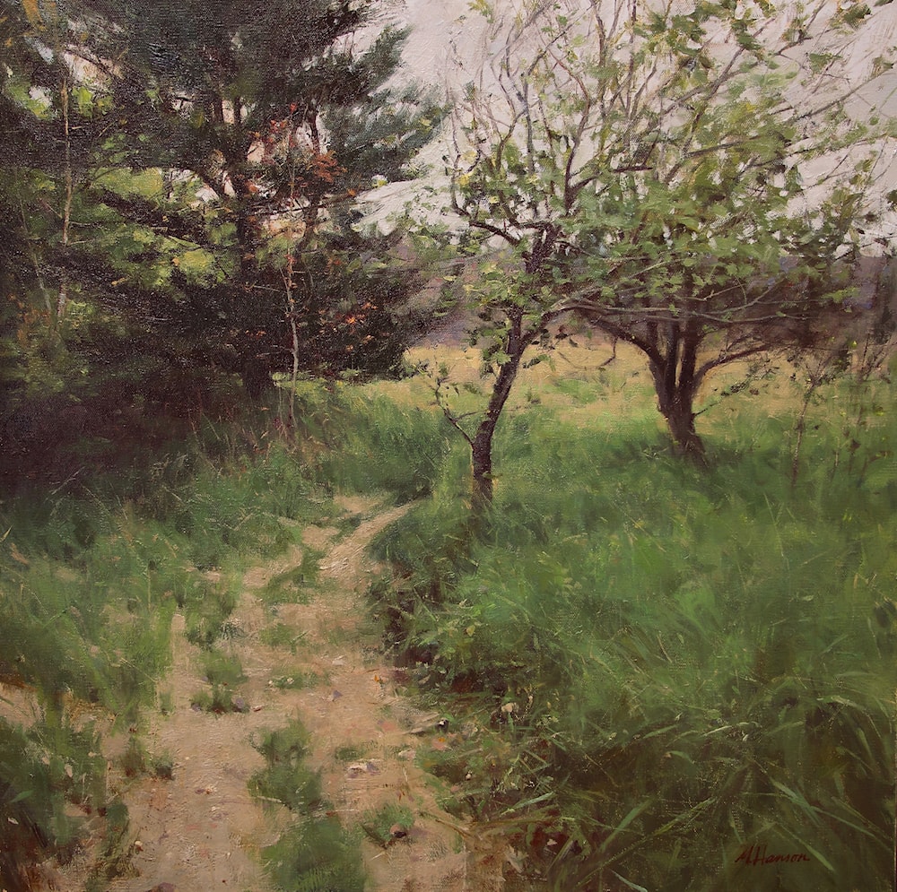 There is something compelling about anything that has been around a long time, an old farmhouse, a large metropolitan structure, old boats. I've always been fascinated by farmsteads, probably coming from my family roots of prairie pioneers who lived in sod houses and built farmsteads out of the limited supplies that they could wagon in on their own. This painting was painted after a stroll through and old orchard, the trees past their prime, and on their way to enriching the soil with their remains. Yet they seem to hold stories about what has blown through and past, their leaves and branches through the decades of producing for us. I can imagine a farm family spending their days in it, picking wooden baskets full of fruit that would have eventually been preserved and put into the basement for winter use.