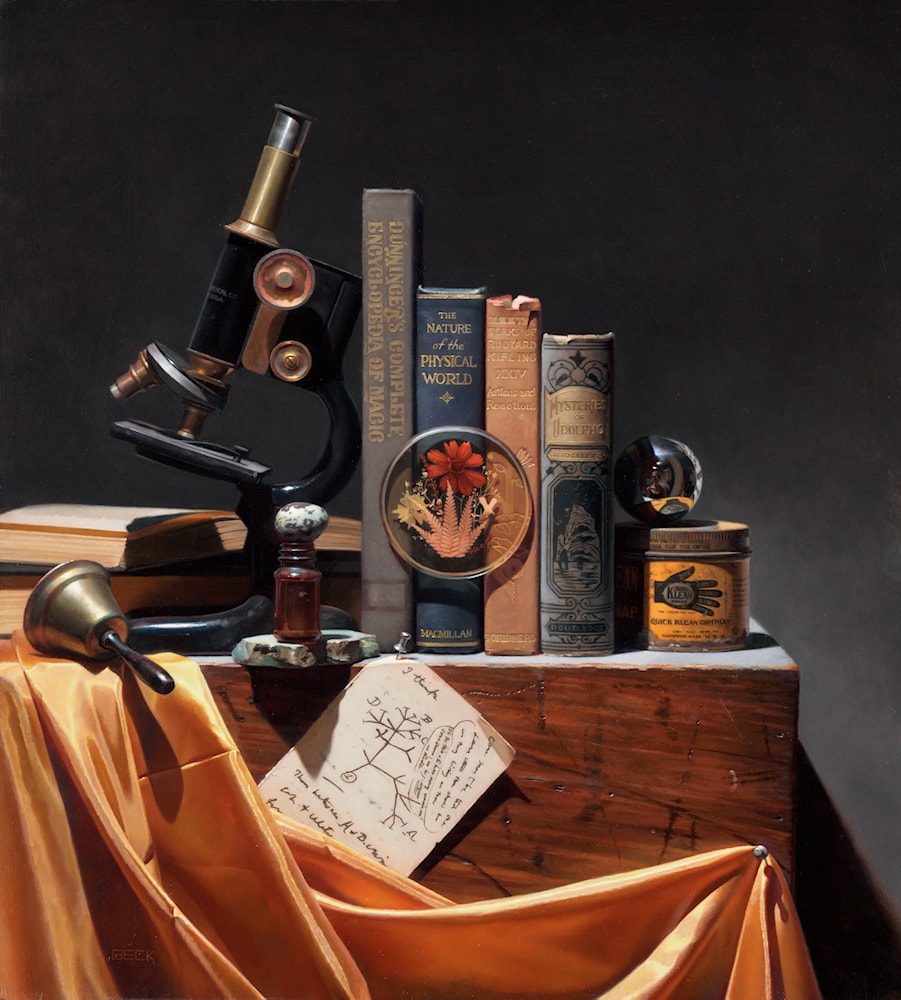The Hundredth Monkey may have started as a still life inspired by a grey, gold, and black piece of fabric, but it ended up being a painting that dances around the concept of human exploration both internally and externally, while also echoing the still life works of the Dutch Golden Age. There are objects relating to magic and science (two sides of the same coin) and also items which suggest self exploration (mirrored ball, and Darwin's classic "I Think.." in his notebook). Also included are the ways in which humans explore and experience the world (sight - microscope, sound - bell, touch - hand, taste - egg, smell - flower).