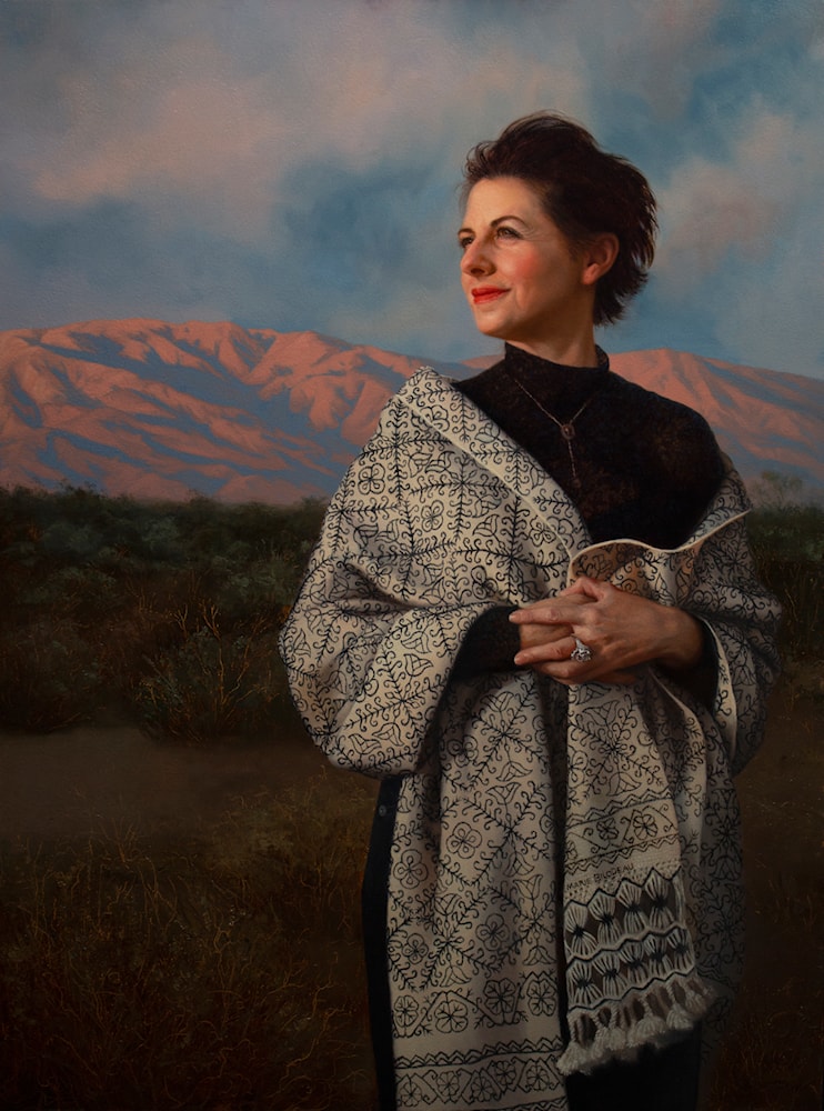 When I met Eve-Marie, we instantly connected over our love of the landscape and nature. Eve-Marie had expressed early on of her love for the beauty of Palm Springs and her spiritual connection to the desert. The shawl wrapped around Eve is one of her own creative design and I enjoyed the contrast of the geometric floral pattern against the natural flora around her. When painting Eve-Marie gazing into the warmth of the sun kissed landscape, I imagined the grounding and invigorating connection we all feel when we are immersed in nature. A repeating theme in my work is using the landscape or environment around my subject to reflect their interior world, so it felt fitting to paint her portrait where she feels the most connected to herself and to nature. After all, portraiture is not only about capturing the physical likeness of the individual, but also of their personality and spirit (pneuma, the title meaning spirit).