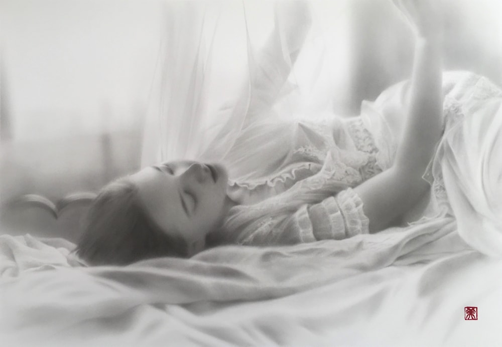 In this work, instead of drawing directly on paper with pencil, I put graphite powder on a makeup brush and patiently drew it using my own unique style. I really like that there isn’t the graphite shine you typically see in pencil drawings, and no matter which angle you look at it from, the texture is soft and smooth.