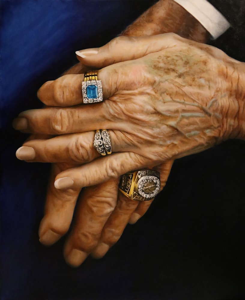 “All These Years is a portrait of the relationship between Clyde and Elsie Frost, rodeo royalty, who celebrated fifty years together this past autumn. Clyde is a Ben Johnson Memorial Award recipient, and Lane, their late son, was a world champion bull rider and a member of the Pro Rodeo Hall of Fame. The movie, 8 Seconds, was based on Elsie’s original story of Lane’s rise in the rodeo world. Elsie fondly tucks her fingers into Clyde’s bronc riding ruined hand. They are both adorned with the evidence of trials and joys celebrated years ago, as well as today. The beautiful swollen joints, veins, and spots are well earned and reflect perfectly the character of the couple as the hardworking, down-to-earth people they are.” – Nancy Hines