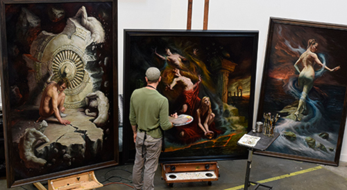 Christopher Remmers is an American painter based in the Pacific Northwest. Having studied classical painting and drawing under Virgil Elliott, he moved on to study narrative composition and design under the guidance of Tenaya Sims at the Georgetown Atelier. His work is recognized for its realistic depiction of the human form in surreal environments. His large-scale, figurative paintings explore mysticism and psychedelia through the timelessness of mythological narratives. Christopher’s work has received recognition from the ARC Salon and can be found in collections around the world. He is represented by 33 Contemporary Gallery in Chicago.