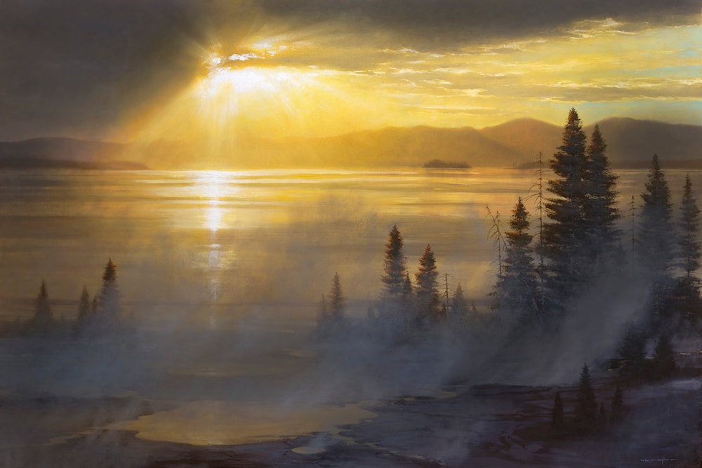 I was inspired to create this painting after an early morning drive with my children along Yellowstone Lake. The sun burned through the clouds illuminating the hot steam emanating from the earth. These ethereal moments beckon my soul to share the wonders and temporal qualities of creation.