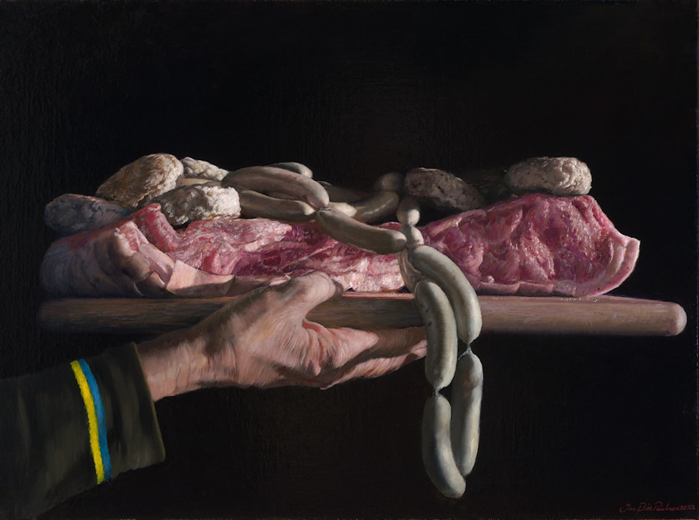 A sumptuous display of meats stacked and overflowing on top a wooden cutting board. Light from a nearby window shines down dramatically illuminating both the still life and the hand of the server who is presenting this bounty to the viewer. Although an appetizing display, to the artist, this work also holds deep political meaning and was inspired by the war in the Ukraine. The sleeve of the server bares the colors of the Ukrainian flag.